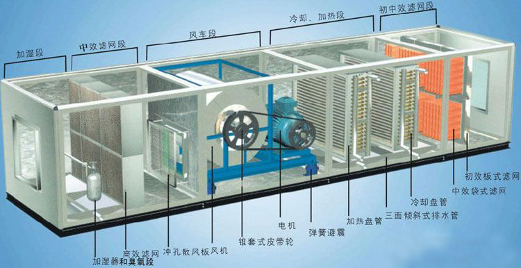 混合段、過濾段、表冷段、加熱段、加濕段、消聲段、風(fēng)機(jī)段等功能段獨(dú)立制造,再依據(jù)不同的使用要求加以組合,從一般性的舒適性空調(diào)用途到要求嚴(yán)格的醫(yī)院手術(shù)室及集成電路無塵室等潔凈工藝性空調(diào)均可滿足要求。機(jī)組的高度和寬度可以靈活選擇以適應(yīng)現(xiàn)場條件對(duì)機(jī)組外形尺寸的需要。可以散件發(fā)運(yùn)至工地,再在現(xiàn)場安裝組合。